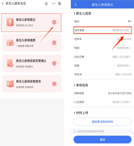 2、选择“新生儿参保登记”填写信息,证件类型可选择居民身份证(户口簿)或出生医学证明。