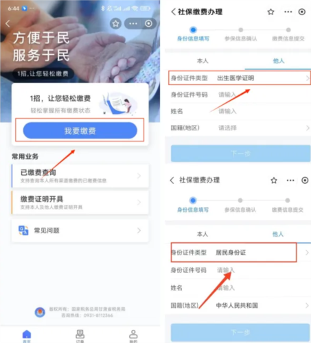 5、进入“新生儿服务专区”选择“新生儿参保缴费”,跳转至税务页面后点击“我要缴费”,授权后填写新生儿信息完成支付;证件类型可选出生医学证明或居民身份证。