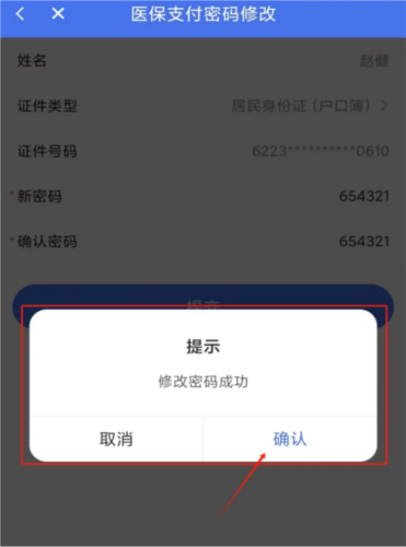4、验证成功后系统将提示“修改密码成功”,之后即可使用新密码在定点医药机构进行医保结算。
