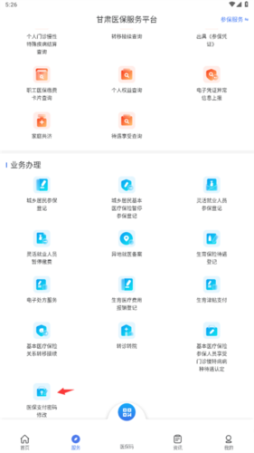 1、登录甘肃医保服务平台app,在“服务”区域定位至“业务办理”模块,选择“医保支付密码修改”功能。