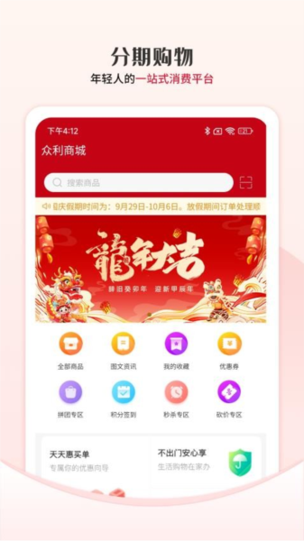 众利商城app是一个提供分期购物服务的平台,这里商品种类丰富,能够满足您多样化的日常采购需求。从心仪好物到生活必需品,您都可以方便地浏览并下单,让购物变得简单轻松。平台支持灵活的分期付款方式,您可以根据自身情况选择合适期数,有效减轻消费负担,享受更贴心的购物服务。每天还能领取多种优惠券,直接节省开支。同时设有拼团、积分兑换和砍价等实用活动,帮助每一位用户买到实惠,轻松享受购物的乐趣。