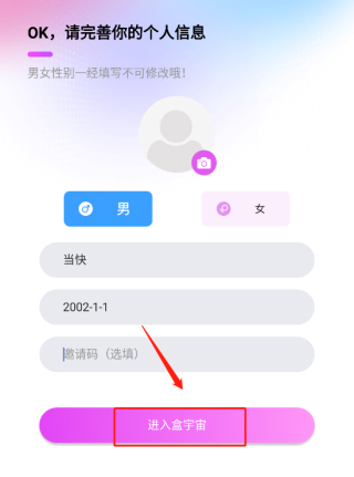 接着选择性别,填写昵称与出生日期;邀请码为选填项;完成以上步骤后,点击进入【盒宇宙】即可。