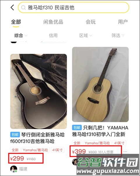 (2)搜索商品关键词,例如“雅马哈f310民谣吉他”,查看同类商品、相似成色的市场价格,在此基础上定价,可以预留大约百分之十的议价空间。