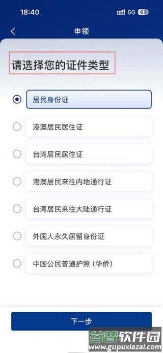 2. 选择证件类型,通常为居民身份证,其他证件按图示选择;