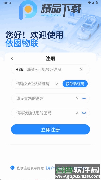 2、在注册页面输入您的手机号码、收到的验证码以及设定的登录密码,即可完成账号注册。