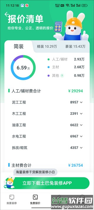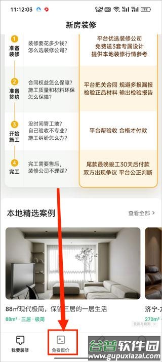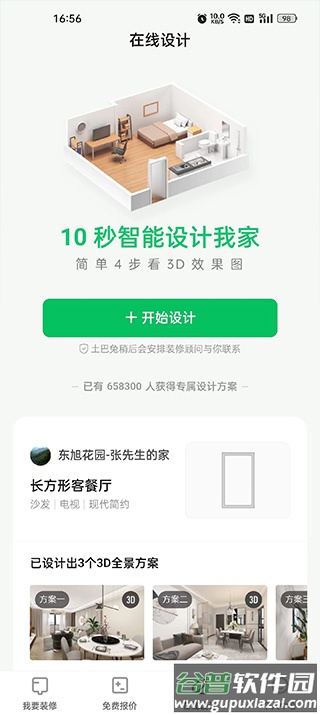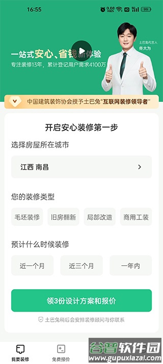 1、通过本站下载并完成安装,注册登录后进入首页,填写房屋类型即可领取三套设计草案及初步报价;