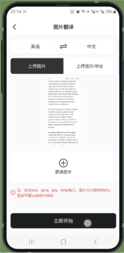将图片中的文字翻译成指定语言,支持拍照翻译、相册选图翻译及网络图片翻译,结果可保存为新图片。