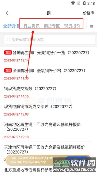 3、点击进入铜板块,即可查看各地铜价信息、价格表以及行业资讯等内容。