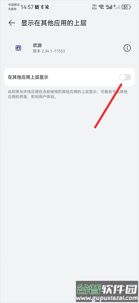 4、随后在手机的系统设置中找到欢游应用,将其“在其他应用上层显示”的权限开关打开即可。