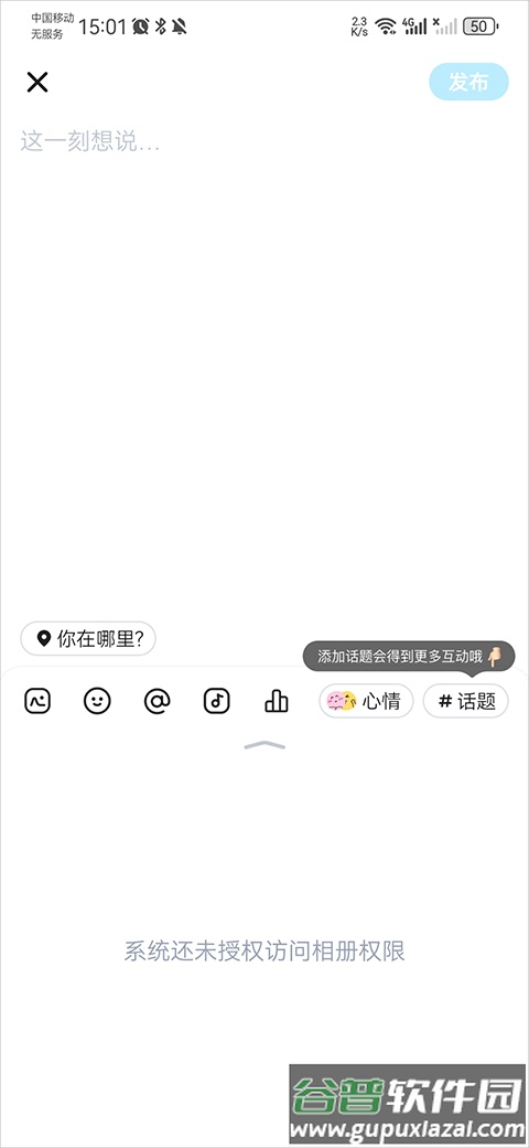 2、输入你想分享的文字内容,可以添加图片、表情、音乐或选择话题;编辑完成后点击发布按钮。