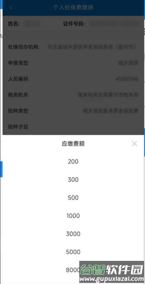 选择【自主申报】后,进入缴费界面,缴费人需要选择缴费年度、应缴费额(可以选择200、300、500、1000、3000、5000、8000,共7个档次)。