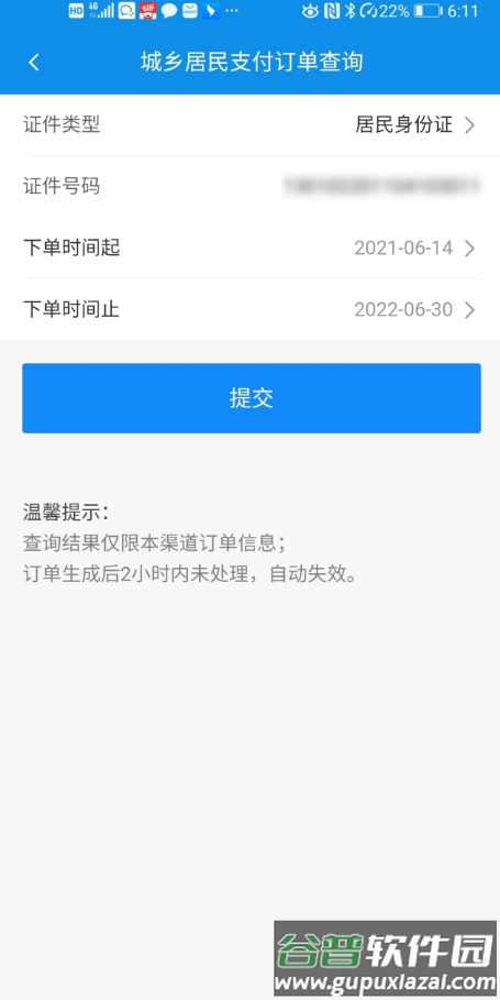 输入证件号码,下单时间,单击【提交】按钮。