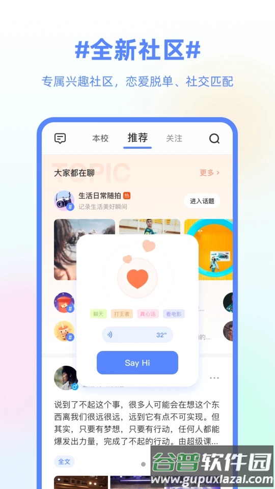 提交个人资料并录制语音后,系统算法将分析你的社交偏好,从数百万同学中筛选出可能与你志趣相投的朋友,帮助你建立真实的校园关系。