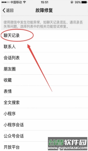 5、在故障修复页面中,找到并点击聊天记录选项。