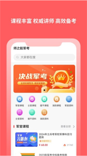 该应用是师之航军考的核心产品,深刻理解士兵与军官考生在备考中的实际困难。其目的是借助智能学习工具与系统化课程,协助考生高效准备,自信面对各类军校招生考试。无论是解放军、武警、边消警或专升本考试,还是士官单招、本科提干、消防考学、军队文职等需求,都能提供针对性服务,确保每位使用者找到合适的学习方案。