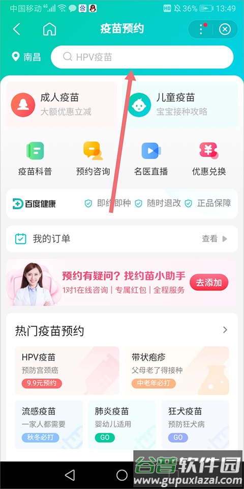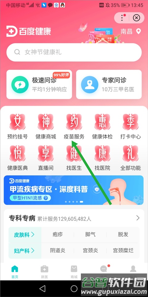 1、用户使用百度账号或手机号登录百度健康app,进入首页后点击下方绿色箭头所指的【疫苗服务】。