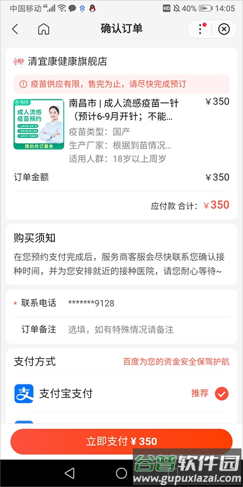 8、最后在新页面中确认联系电话(系统将自动匹配登录手机号),点击【立即支付】完成支付即可。