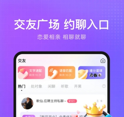 恋爱星球提供速配情缘,用声音快速交友;交友广场是想聊就聊的入口,支持恋爱相亲;心动爆灯功能帮助牵手成功,堪称恋爱神器;浪漫礼物可随时赠与佳人,表达心意。