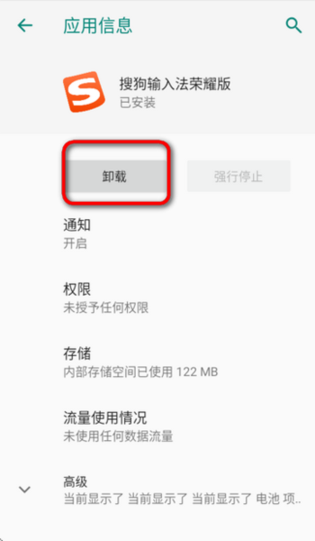 1、进入手机的应用管理界面,找到搜狗输入法的应用信息,其中包含卸载选项。