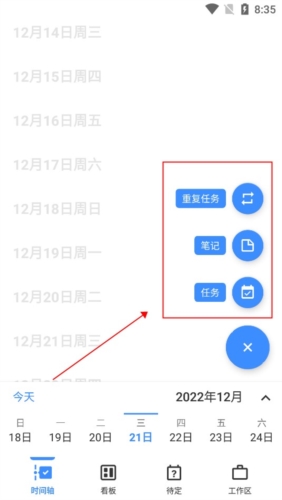 2、页面将跳转到所选日期,点击右侧添加按钮,根据需要选择【重复任务】、【笔记】或【任务】分类;