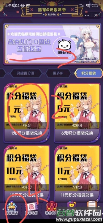 2、将导航栏滑动到底部,找到“1元积分福袋”并点击进入。