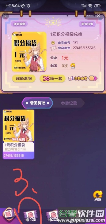 3、点击“抽一次”完成购买,记得需要再次点击抽取,积分券才会存入你的背包。