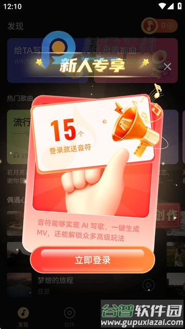 1、新用户注册登录后,可免费获得15个音符。