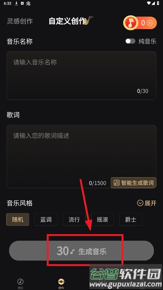 登录后进入创作界面,输入音乐名称与歌词,点击生成音乐即可开始创作。