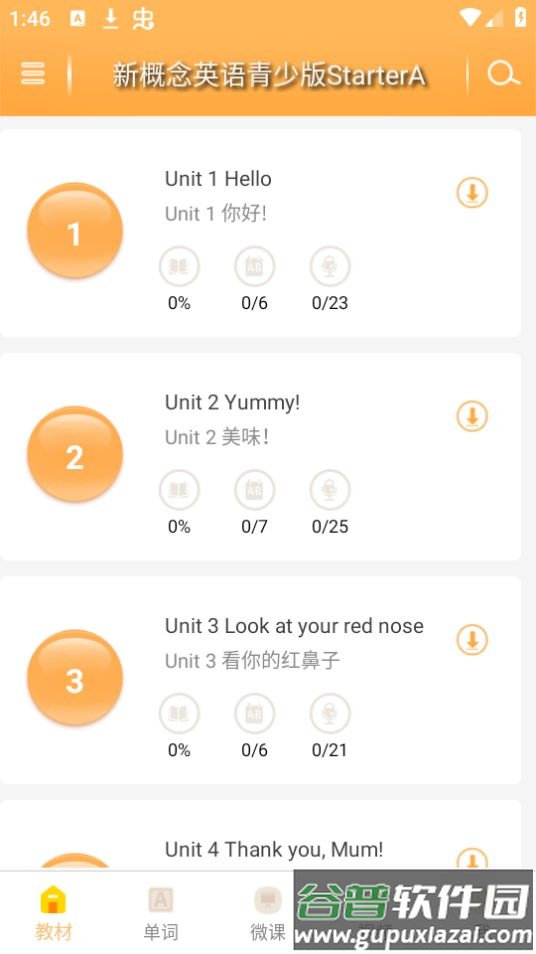 2、完整收录新概念四册教材,可切换英美发音,界面设计简洁清晰;