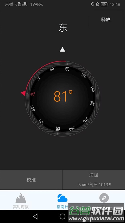 3. 指南针会精准指引方向,此页面同时显示海拔及气压数据。