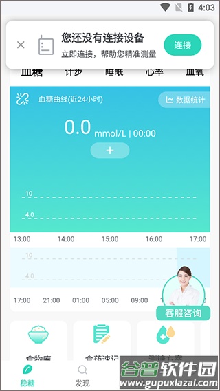 1、打开并登录稳糖app,点击首页上方的【连接】入口。