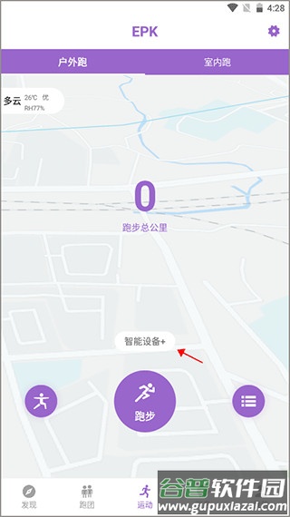 1、首先打开手机蓝牙,进入软件“运动”板块,点击页面上方的“智能设备+”。