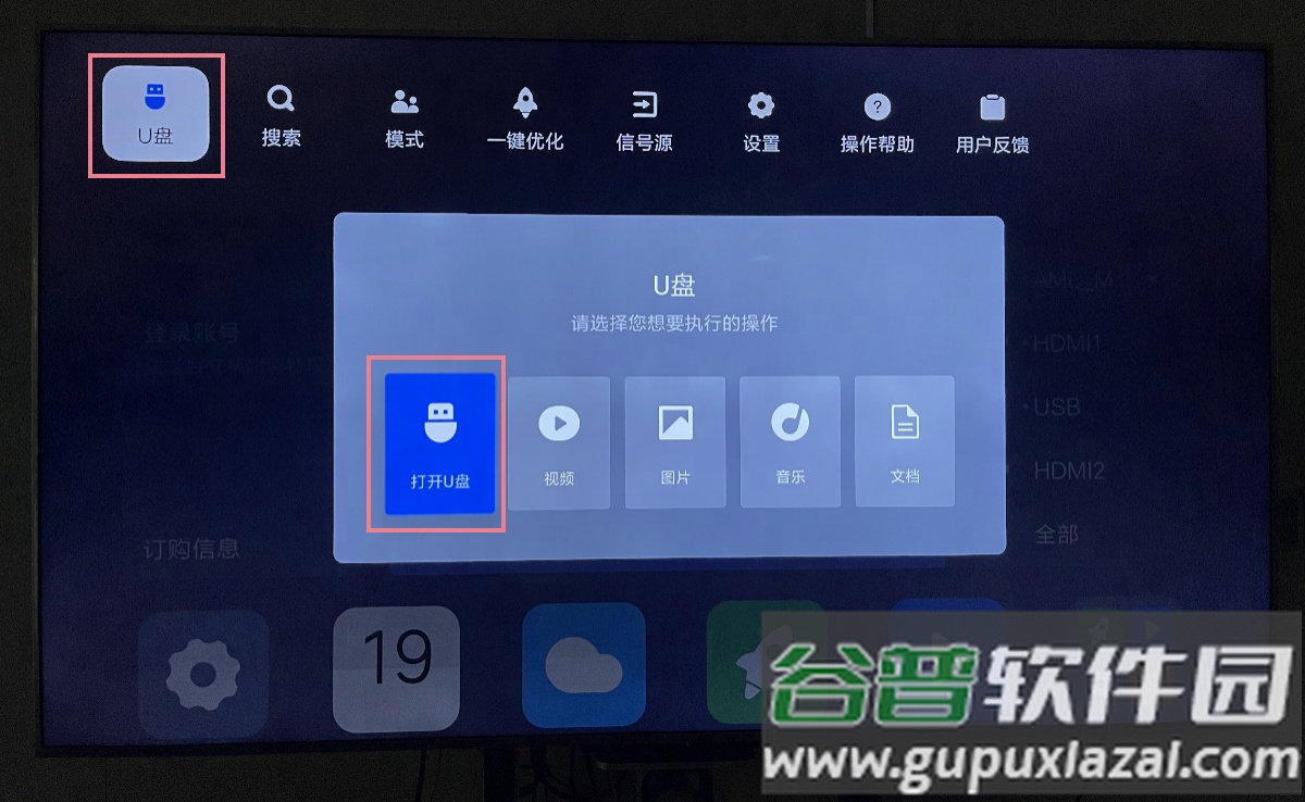 二、将U盘插入电视,在弹窗中选择“打开U盘”;若未弹窗,可在电视首页顶部按“上”键查找U盘入口。