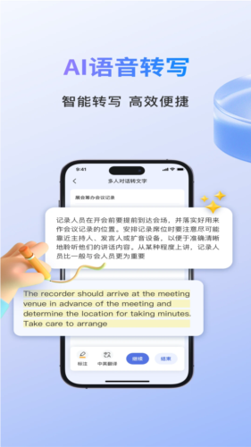 3、高效语音转写: 支持长时间录音的快速文字转换,准确率高;能够智能提炼内容要点并自动生成摘要,简化录音整理工作;结合声纹区分技术,可在多人对话中清晰标注不同说话者,方便回顾。