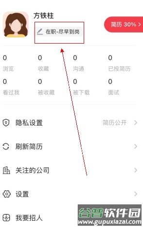 1、打开应用,进入【我的】页面,点击“求职状态”进入设置。
