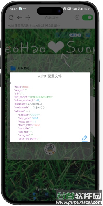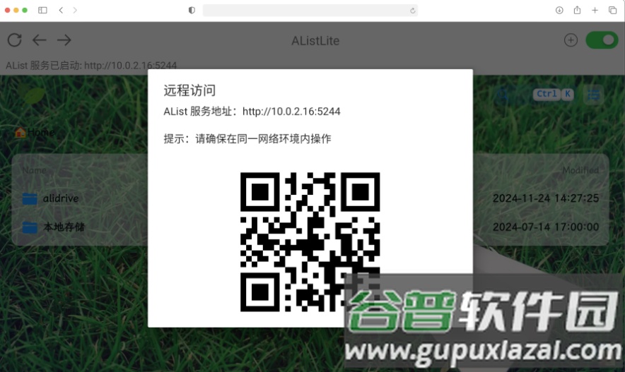 4、点击右上角开关,开启或停止 AList 服务;服务启动成功后将显示 AList 前端页面,同时在上方标识当前绑定的 IP 地址与端口。