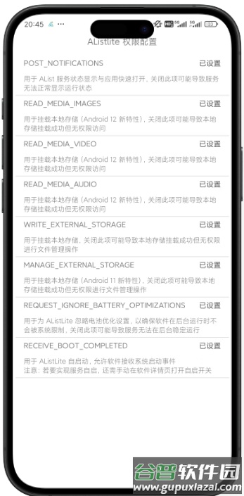 6、首次打开 APP 后,软件将申请必要的存储、通知与后台运行权限,权限授予情况可点击软件右上角 + 号,进入 权限配置 页面查看。