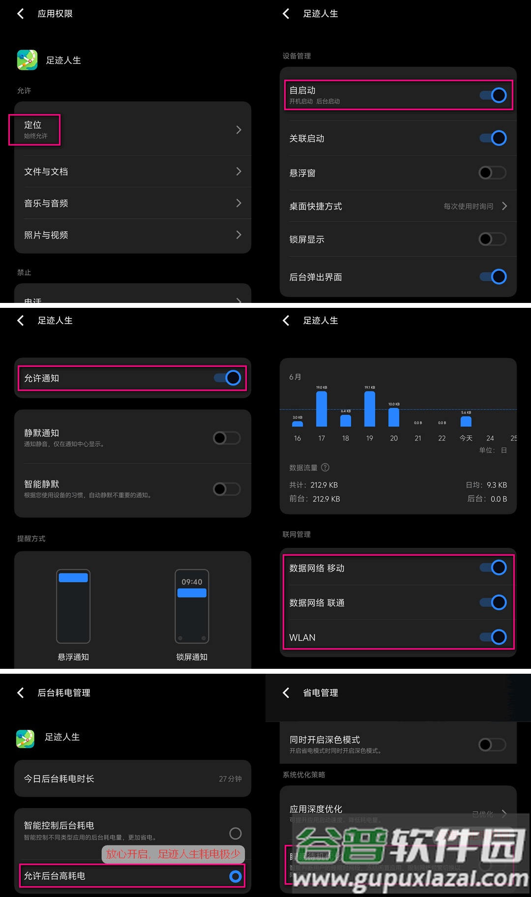 提示:后台耗电和通知权限、联网权限也非常重要,请按图设置。