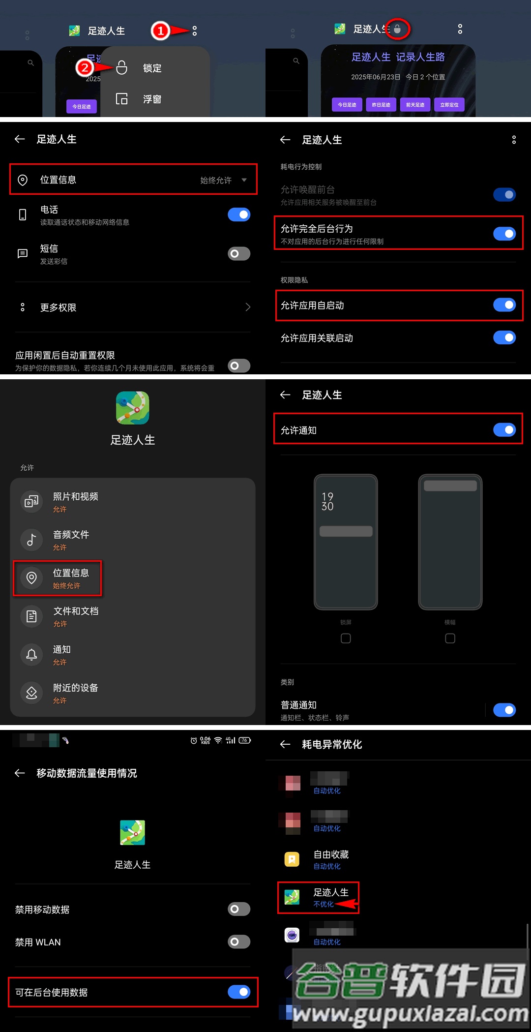 注意:上图的睡眠待机优化曾困扰较长时间,后来发现是它在影响,一定不要开启;非所有手机都有此选项。定位权限设置中选择始终允许而非仅在使用时允许,这样APP才能在后台持续记录轨迹;在多任务界面将APP锁定,避免被系统自动关闭。