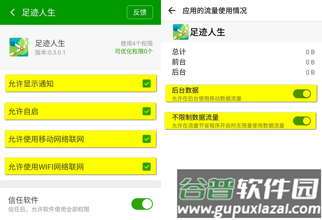 提示:也可以如上图完全信任APP,给予所有权限,简单快捷;足迹人生不会读取本程序外的任何文件信息,从网络流量可以看出,程序联网传输数据极少,正常一天一般不超过50k,不足一张普通照片的两百分之一,可以放心。
