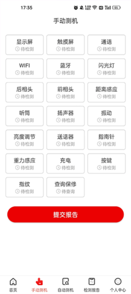 2、点击“手动测机”,根据手机实际情况选择可用功能,完成后提交检测报告;