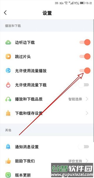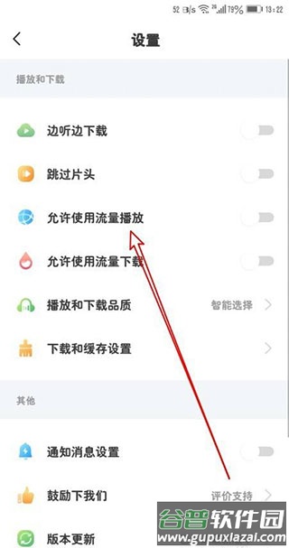3、在设置列表中找到“允许使用流量播放”这一项。
