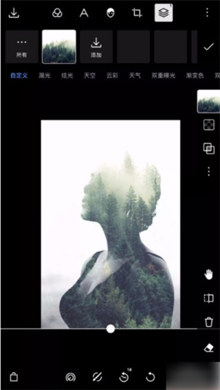 2、此时已形成多重曝光效果,因为该界面下所有素材的混合模式已默认设为“变亮”。可以随时切换其他图片素材;