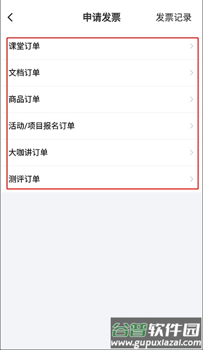 3、在“申请发票”页面,可选择需要开票的订单类型,包括课堂订单、商品订单、文档订单、活动或项目报名订单以及测评订单。