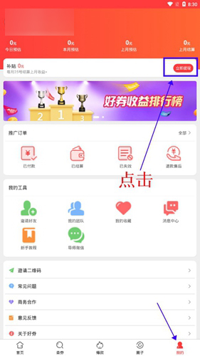 首先进入【我的】板块,找到“补贴”项,这里显示的即为累计佣金,点击右侧的“立即提现”。