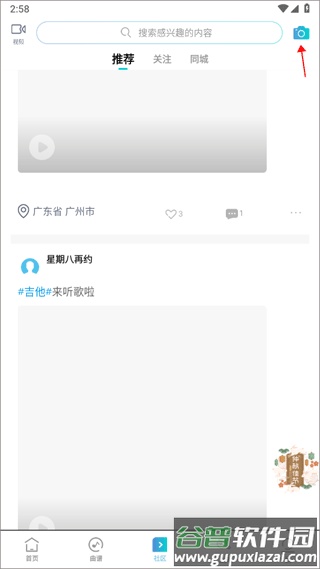 1、使用手机号和验证码登录账号,进入【社区】界面,点击右上角的照相机图标。