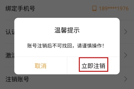 3、最后点击“立即注销”按钮,即可完成账号注销操作。