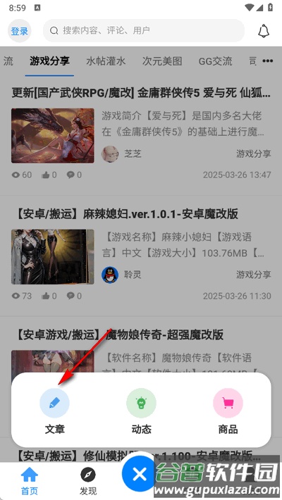 2、在弹出的选项中,选择发文章功能,随后编辑内容进行发表。