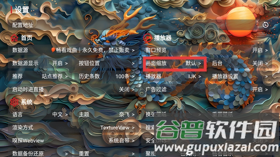 2、在设置中找到画面缩放选项。