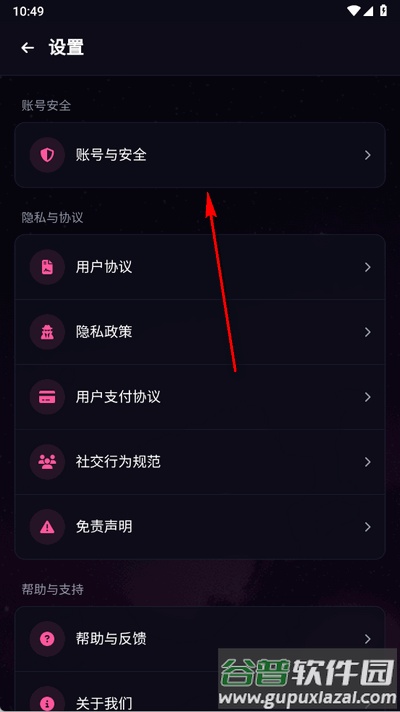 2、在设置中找到账号与安全,点击进入。